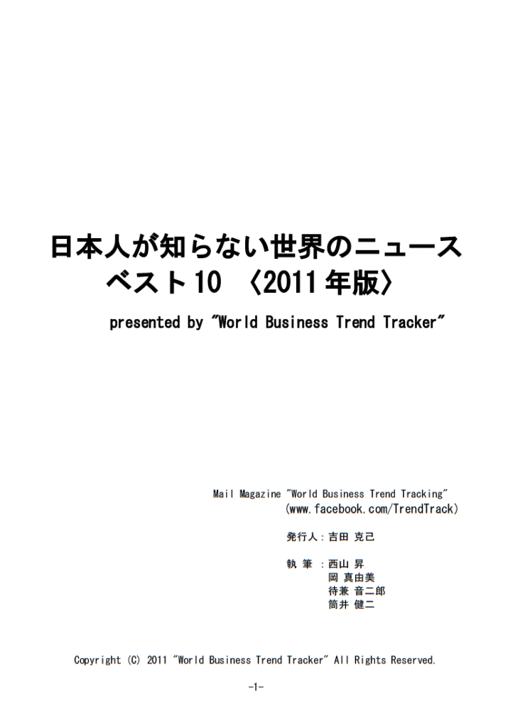本冊子は、2011年5月8日創刊のメールマガジン"World Business Trend Tracking"の試読版を兼ねたサマリーです。