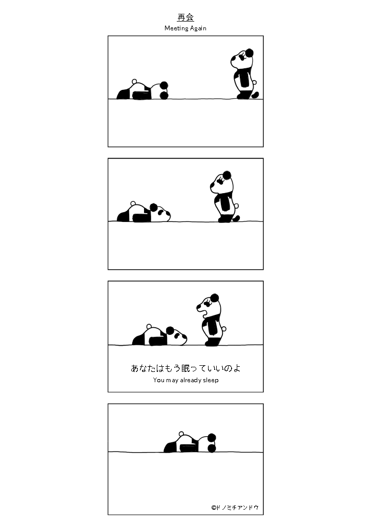 セリフが一言だけで1ページの絵本のような4コママンガです。 本作と同じパンダのキャラクターが登場する別の自作4コママンガを元にしていますが本作はセルフ二次創作の独立した作品となります。